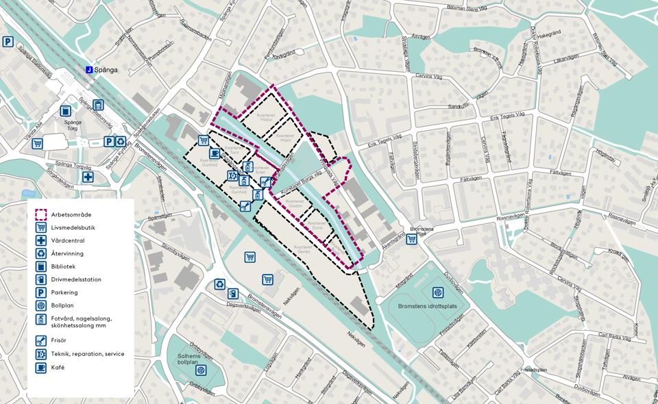 Olika former av service bland annat livsmedelsbutik och restauranger finns vid Bromstensplan. Spånga centrum har ett brett utbud av affärer och service till exempel bibliotek, vårdcentral och flera livsmedelsaffärer. På andra sidan Mälarbanan vid Bromstensvägen/Spångavägen finns bland annat livsmedelsaffär, drivmedelsstation och ett djursjukhus. Det finns även många idrottsplatser i närområdet. Bromstensstaden ligger nära allmänna kommunikationer. Här nedan finns användbara länkar till olika former av service.