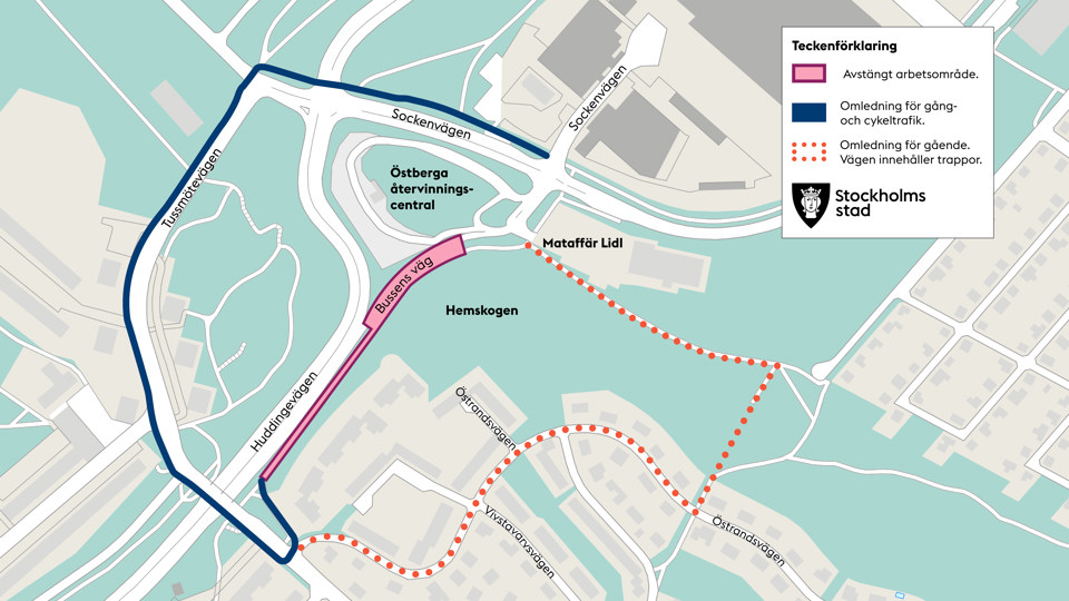 Gång- och cykelvägen längs med Huddingevägen och Bussens väg stängs av i höjd med Tussmötevägen. Gående och cyklister mellan Huddingevägen och Sockenvägen leds om längs Tussmötevägen.