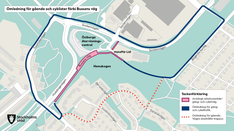 Gång- och cykelvägen längs med Huddingevägen och Bussens väg är avstängd i höjd med Tussmötevägen. Gående och cyklister mellan Huddingevägen och Sockenvägen är i stället hänvisade till Tussmötevägen.