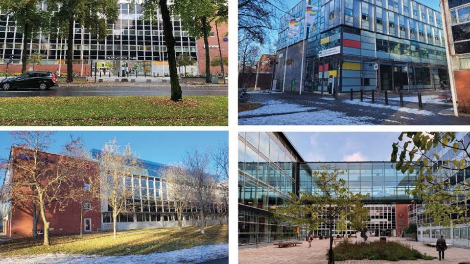 Dramatiska institutet. Den har ett samtida formspråk med fasader av glas