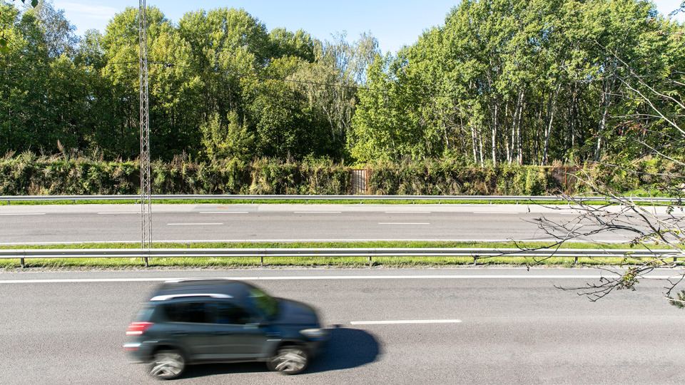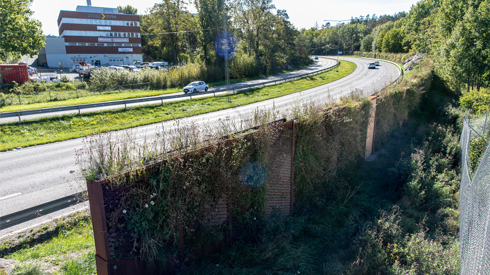 För att en större del av naturreservatet ska ha den ljudnivå som är rekommenderad av Naturvårdsverket behövde vi bygga en bullerskyddsskärm längs med Huddingevägen. Den gröna bullerskyddsskärmen består av moduler av metall som innehåller ljudisolerande material och växtsubstrat. I växtsubstratet kommer med tiden växter som finns i omgivningen att växa. En växtbeklädd bullerskyddsskärm absorberar ljud bättre än traditionella skärmar och tar även upp luftburna partiklar. Dessutom bidrar en växtbeklädd skärm till ökad trivsel.