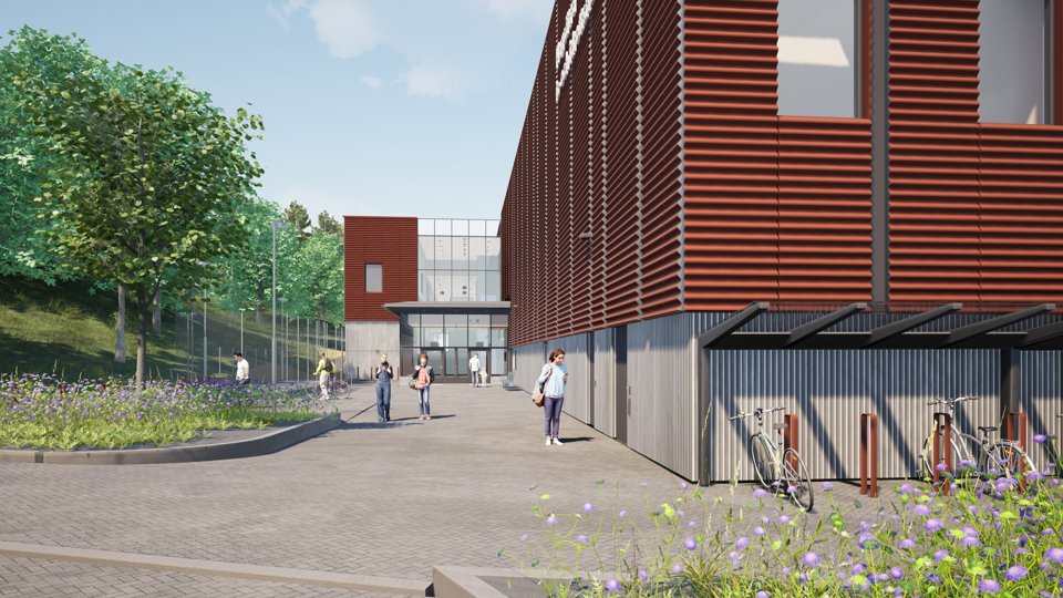 Vi gestaltar byggnaden med omsorg så att arkitekturen stärker platsen och dess identitet. Vid entrén till anläggningen planerar vi en mötesplats i form av ett entrétorg, vänd i riktning mot övriga idrottsplatsen. Vi ser även över utomhusmiljön närmast anläggningen för ökad trygghet på idrottsplatsen.