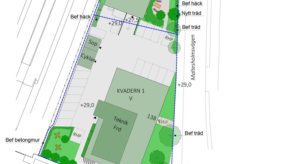 I förslaget ingår även allmän parkering genom ombildning av en tidigare parkeringsplats på mark tillhörande intilliggande fastigheter. Boende- och besöksparkering föreslås lösas i befintligt garage och som markparkering. De nya byggnaderna längs med Maltesholmsvägen planeras ha en tydlig koppling till gatan, till skillnad från hur bebyggelsen förhåller sig till den i dag där mark och parkeringar placerats närmast gatorna.