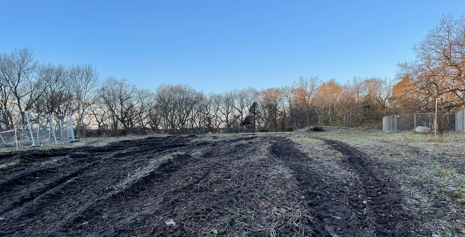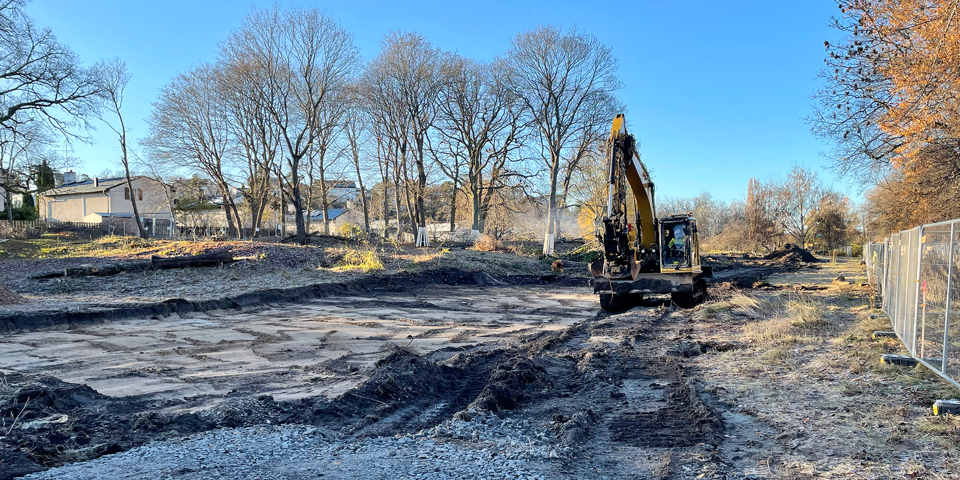 Arbetet fortsätter med att anlägga byggvägarna. Den befintliga jorden kommer ersättas med grus, lämplig för väg. Schaktarbeten kommer utföras på flera platser denna vinter och förvår på Kullen, vid vattnet nedanför koloniområdet, i koloniområdet, i Rosenträdgården och Frukt- och rosenparken. Träd som bevaras är alléträden och andra utvalda träd. Dessa skyddas och den förorenade jorden ovanpå trädens rötter sugs upp med hjälp av vakuumsug/jordsug eller schaktas med försiktig schakt. Ny ren jord läggs sedan på trädrötterna.