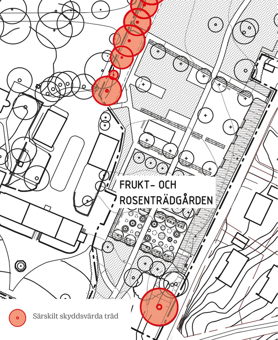 Ytjord byts ut och en del rosor återplanteras i Frukt- och rosenträdgården. Det kommer att finnas ett mindre antal träd och buskar jämför med