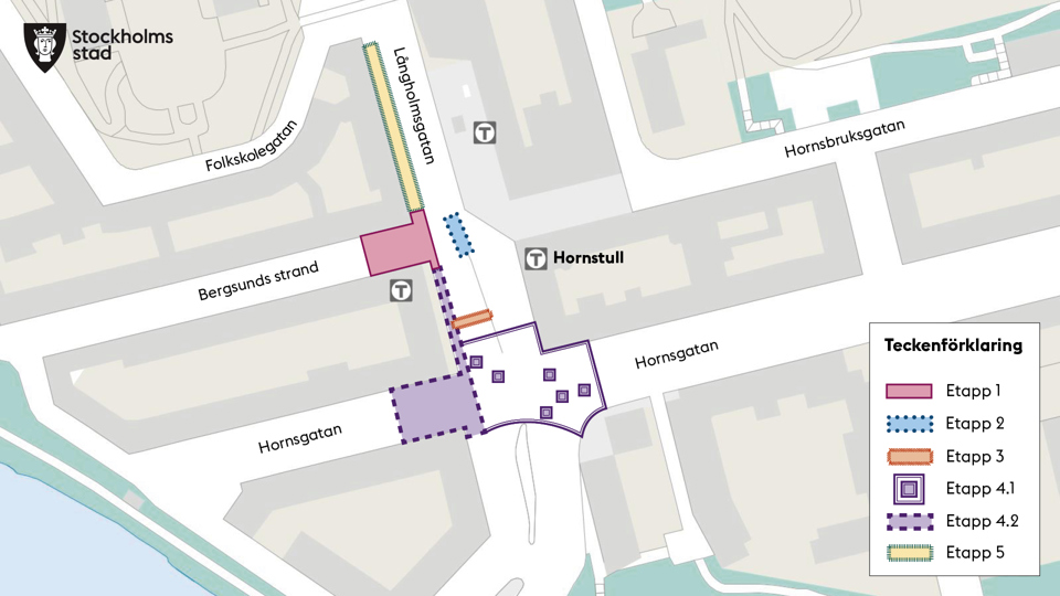 På en del av Hornsgatan, väster om Långholmsgatan, bygger vi ett nytt torg med möblering och cykelparkering. Det innebär att Hornsgatan stängs av för trafik mellan Långholmsgatan och Hornstulls strand.