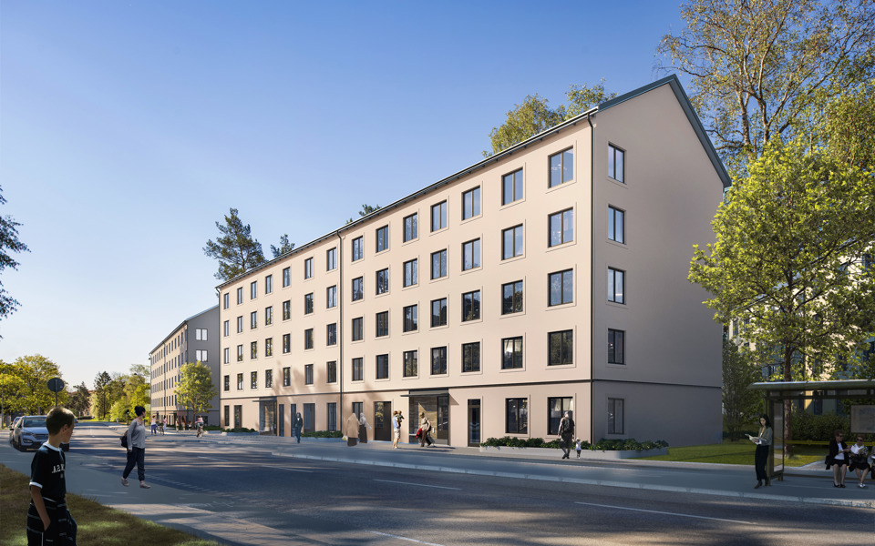 Tre bostadshus med cirka 140 bostäder