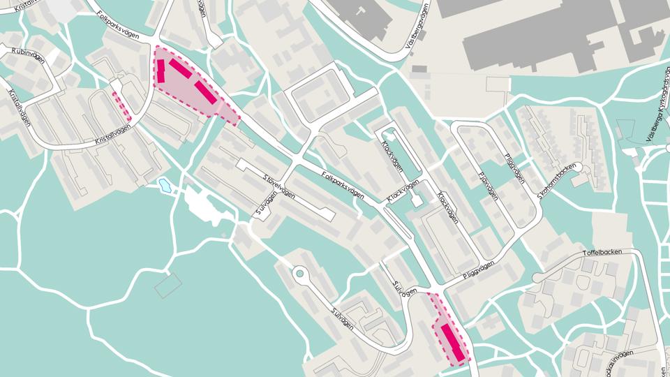 I korsningen Folkparksvägen och Kristallvägen föreslås cirka 100 lägenheter i tre bostadshus. Två av husen placeras längs Folkparksvägen och ett längs Kristallvägen. En innergård med bevarad naturmark skapas i kvarterets södra del. Cirka 500 meter söderut på Folkparksvägen, mittemot Citrusgårdens förskola, föreslås ett bostadshus med cirka 40 lägenheter. Byggnaderna utförs som lamellhus, med släta sadeltak i fyra till fem våningar. Husens placering, höjd och utformning anpassas till den omgivande 50-talsbebyggelsen.