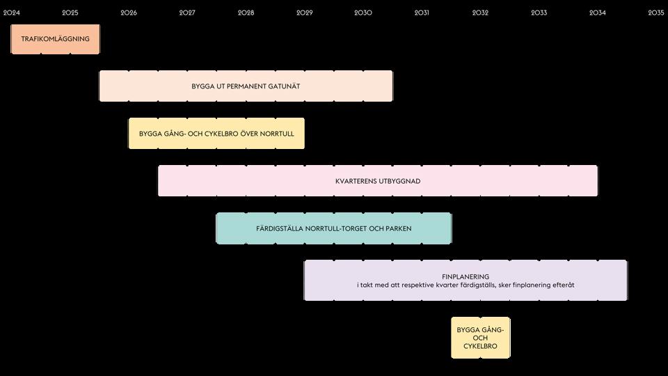 Omvandlingen ifrån hur det ser ut idag, till en tät och levande innerstadsmiljö, är en genomgripande förändring och utbyggnaden kommer att pågå under många år.